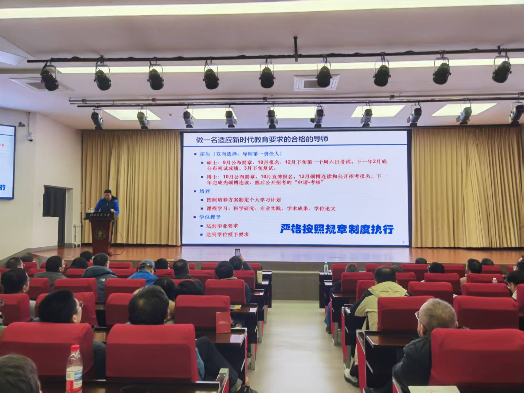 副书记兼副院长宿帅围绕研究生导师职责对全体教师开展了综合培训。他结合具体调研数据,分析阐述了当代学生的新特点,然后从导师职责、新时代导师行为准则入手明确了导师的行为规范、培养研究生应尽的责任。最后,借全院大会之际,对学校工程硕博士的培养改革进行了宣贯。