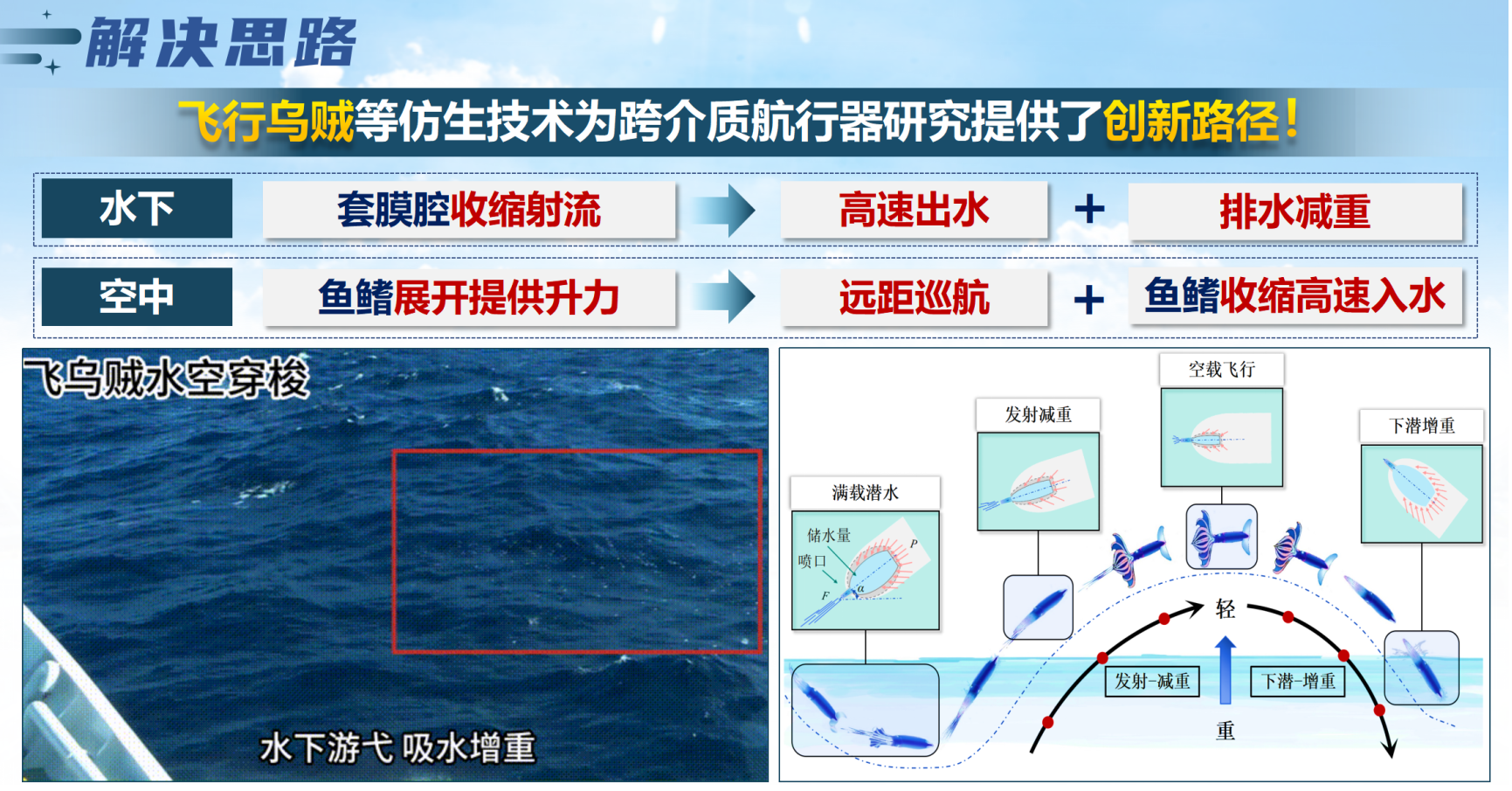 项目简介:团队在侯涛刚老师的悉心指导下,突破三大核心技术:爆燃式射流推进器以双组元气体为燃料,具备水下点火与多次快速推进的能力;设计高速响应变构机翼,凭借单齿轮驱动双边结构,实现主动快速折叠与展开;研发具备水空变速箱和折叠变矩桨叶的自适应螺旋桨系统,能够有效提升螺旋桨在水空两种介质中的推进效率。以飞行乌贼为仿生原型研发水空跨介质航行器,采用爆燃推进式多模态设计,实现水空高效穿梭。飞行乌贼通过套膜腔收缩射流实现快速水空穿梭,同时由于射流具有排水减重机制,能够更好适应环境介质变换;凭借鱼鳍的展开收缩实现低阻力穿梭和空中持续飞行。基于上述仿生灵感,TOTA航行器融合多项核心技术,在水空穿梭快速性、环境适应性与推进效率方面显著优于传统固定翼与多旋翼构型,在民用领域(如一体化探测、堰塞湖救援)与军事领域(如水空快速打击、即时通信中继)具有广泛应用前景。